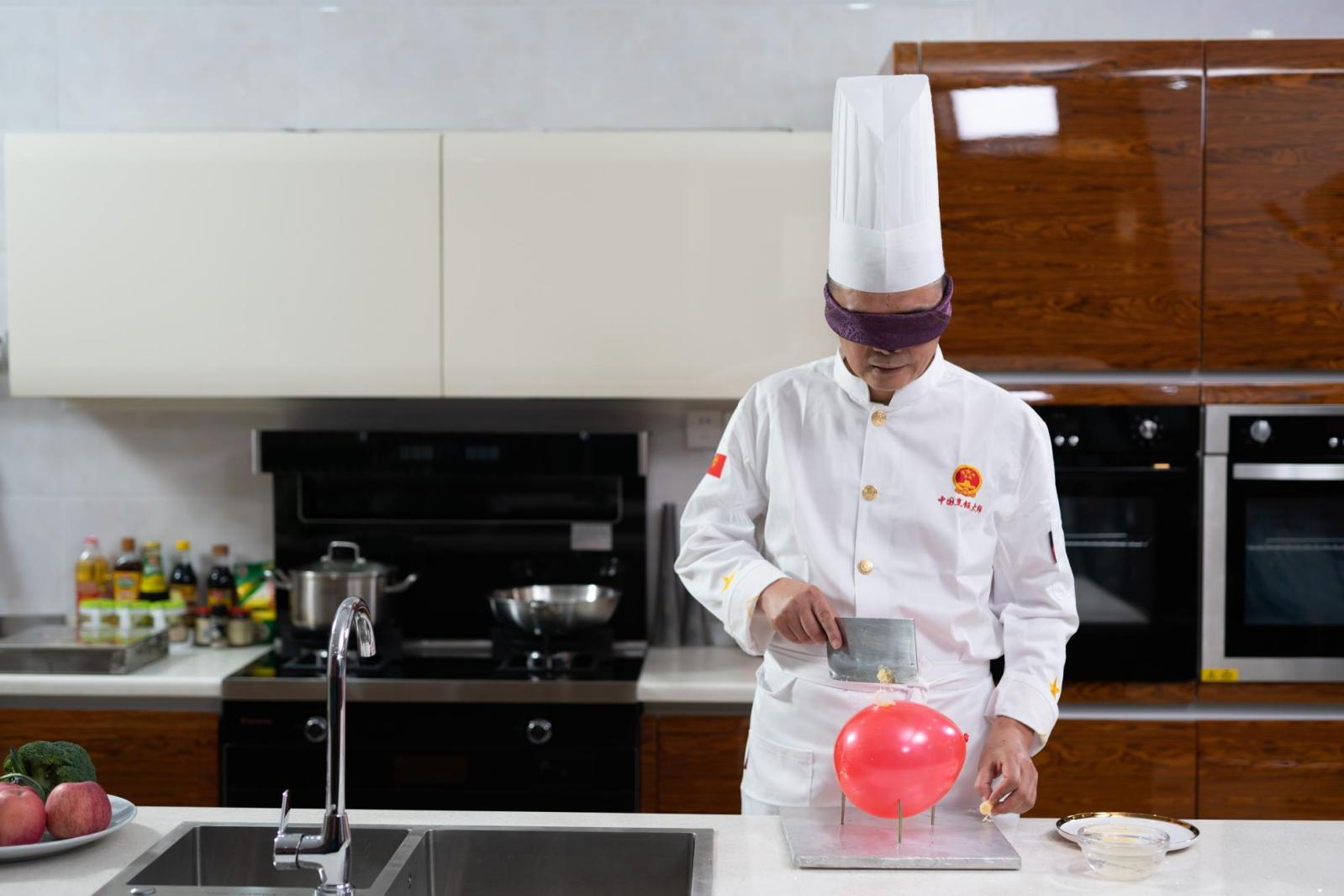 中國烹飪大師:林潮帶先生 展示在氣球上盲(蒙眼睛)切土(tǔ)豆絲